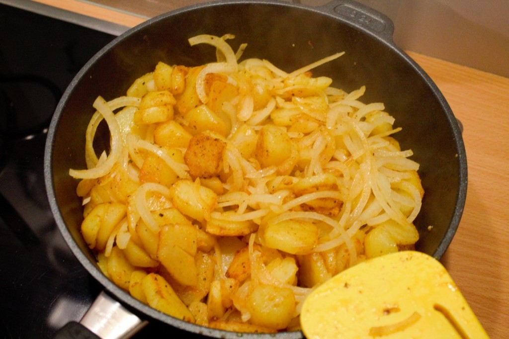 Zutaten: 1 kg festkochende Kartoffeln 1 große Gemüsezwiebel Pfeffer Salz Paprikapulver (edelsüß) ÖlZubereitung: Die Kartoffeln schälen, in gleich dicke Scheiben