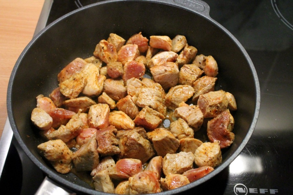 Heute habe ich die Gastrolux-Pfanne als Schmorpfanne benutzt und ein leckeres Gulasch gekocht. Erst einmal habe ich Fleisch und Zwiebeln