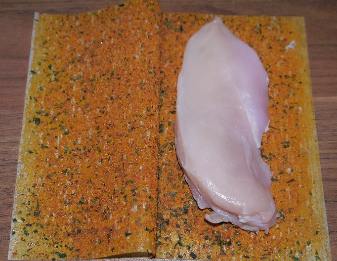 Man nimmt 4 Stück Hähnchenfleisch á ca. 150 Gramm und packt diese in jeweils ein Würzpapier ein. Dann heizt man die Pfanne auf halber Stufe vor und legt anschließend die „Hähnchen-Pakete“ ohne Zugabe von Öl oder Fett in die Pfanne. Nach circa 8-10 Minuten wendet man die Pakete und lässt Sie dann nochmal auf der anderen Seite durchgaren.