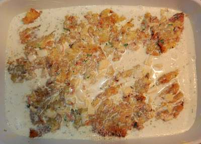 „>die Hälfte der Bratkartoffeln einfüllen, die Schnitzel darauf verteilen und mit dem Rest der Bratkartoffeln abdecken. Die Sahne und das Crème fraîche mischen. Mit dem EL Gemüsebrühe, Salz & Pfeffer & Muskat & Kräuter kräftig würzen sowie den ger. Mozzarella und den fein gewürfelten