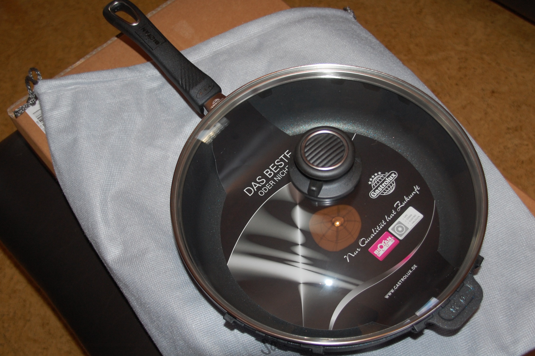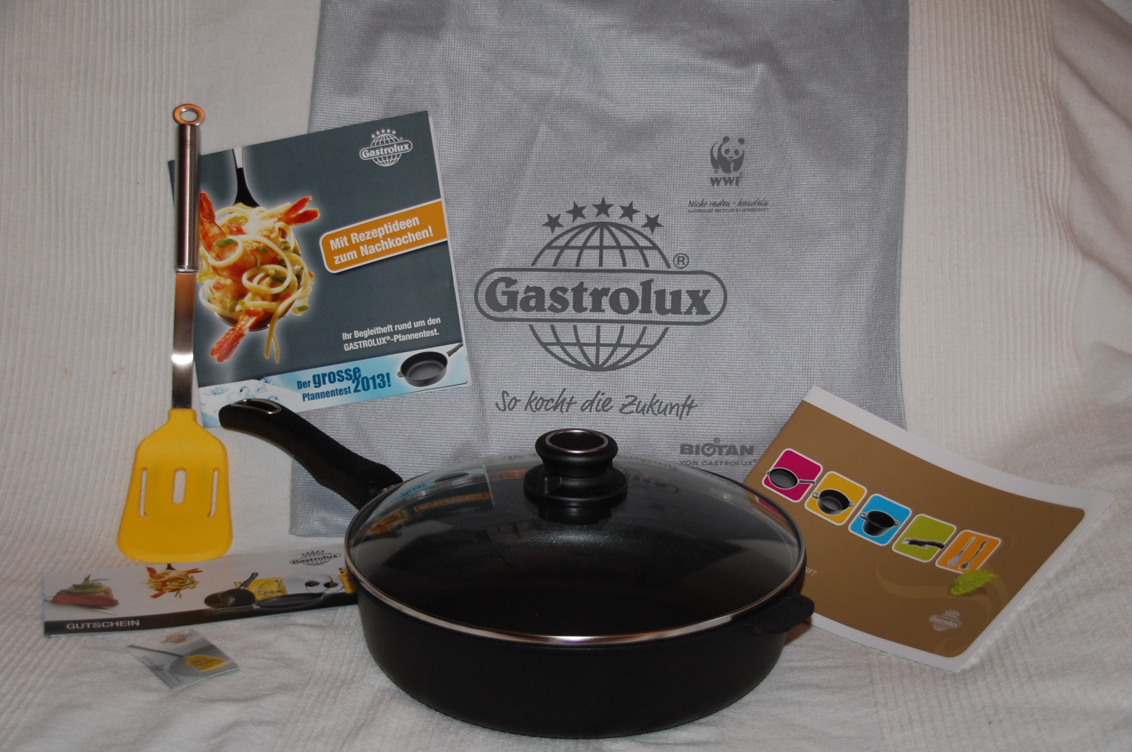 Vor einigen Wochen kam ein riesiges Testpaket von Gastrolux bei mir an. Dabei war nicht nur eine Biotan Plus Pfanne mit 28 cm Durchmesser und hohem Rand, sondern auch noch der passende Glasdeckel mit Entlüftungsknopf und ein hochwertiger Pfannenwender. Außerdem ausführliches Infomaterial inklusive toller Rezeptideen, wie ihr auf den Fotos sehen könnt.