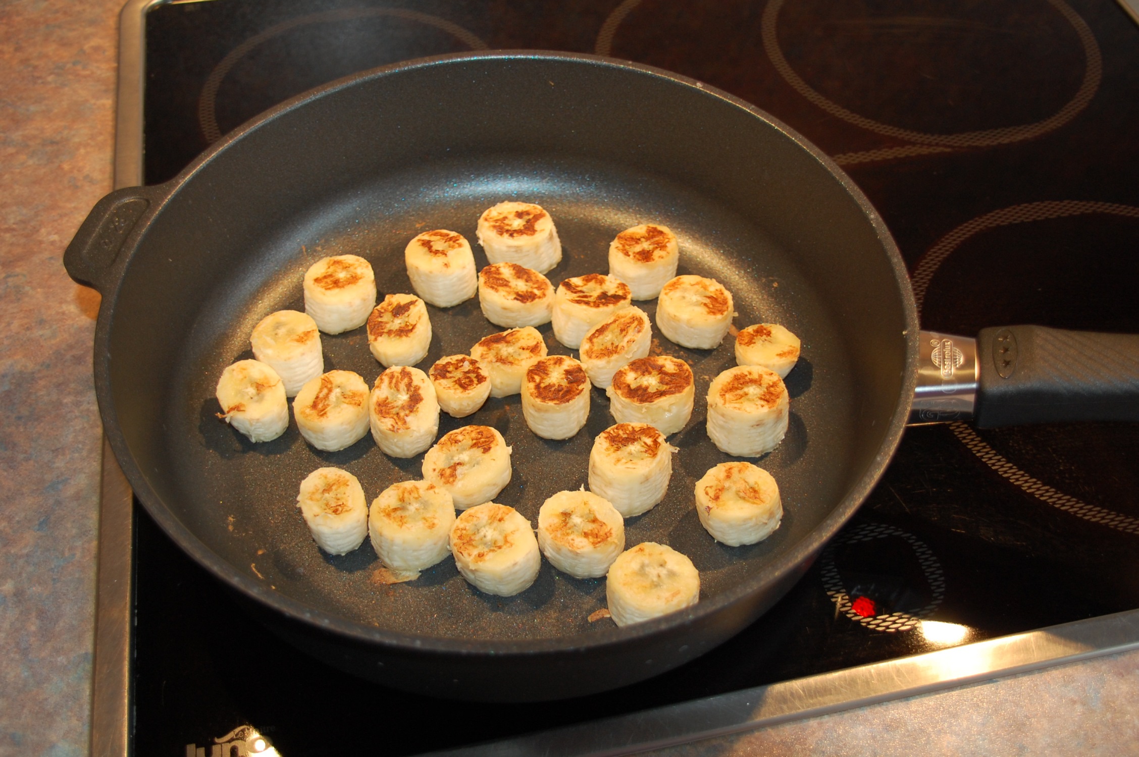 Die Gastrolux Pfanne ist bei mir fast täglich im Einsatz und ich bin von dem hervorragenden Antihafteffekt begeistert! So braucht man nur einen Hauch Fett (Ölsprays zum Braten eignen sich besonders gut). Vieles lässt sich aber auch völlig ohne Fett zubereiten, z. B. in Weißwein eingelegte gebackene Bananen (siehe Foto).