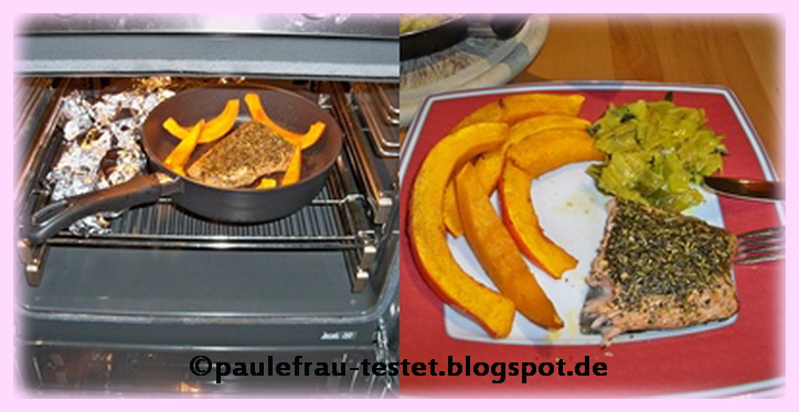 Es gab Lachs mit Kräuterkruste und dazu Kürbisspalten.