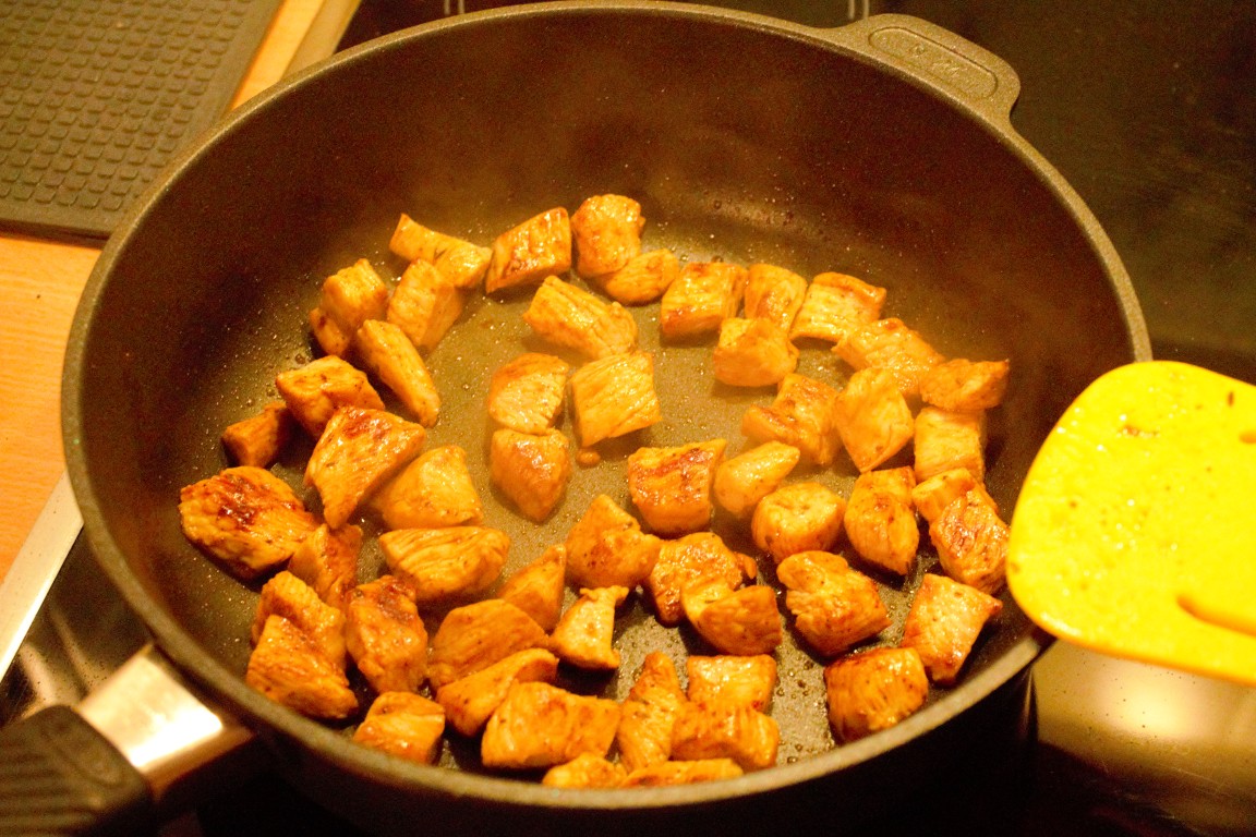 Die Reisbeutel nach Packungsanweisung mit etwas Curry und Salz im Wasser kochen. Währenddessen die Putenbrust klein schneiden, ebenso die Mandarinen und Pfirsiche. Dann die Putenbrust mit Pfeffer, Salz, Thymian, Curry und Paprikapulver in der Gastrolux Pfanne (www.gastrolux-shop.de) anbraten.