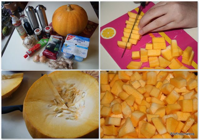 Gastrolux-Pfanne mit etwas Öl erhitzen, Kürbiswürfel hineingeben, mäßig salzen und pfeffern (schwarzer Pfeffer) und etwas anbraten. Aufpassen, dass Ihr nicht zuviel Salz und Pfeffer nehmt, denn die Soße hat es ja auch in sich, lieber zum Schluss noch mal nachwürzen. Dann den Teelöffel Ingwer, die gehackten Zwiebeln und 1-2 gehackte Knoblauchzehen untermischen, kurz mit anschwitzen. Anschließend mit geschlossenem Deckel 10 min. köcheln lassen. Evtl. etwas Wasser beigeben, muss man gucken, darf halt nicht anbrennen. 75g Zucker zugeben, die fertige Tomatensoße unterrühren und wieder bei geschlossenem Deckel noch ca. 10-15 min. dünsten. (Die Garzeit ist je nach Kürbisart unterschiedlich, einfach Garprobe machen).