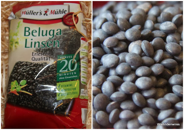 Beluga-Linsen 25min. kochen, dann etwas Wasser abgießen, so dass nur ein bisschen Flüssigkeit im Topf bleibt. Mit Salz, Pfeffer, Essig und Zucker süß-sauer abschmecken, wer mag, kann sie auch etwas andicken.