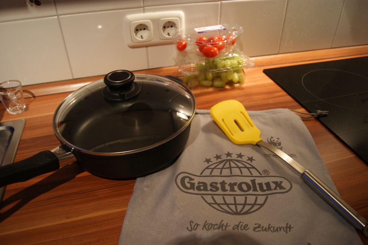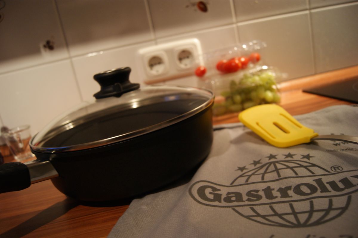 Im besagten Paket war nun eine Pfanne von Gastrolux – und weil mein Freund bei uns ja bekanntlich die Kochmütze auf hat, wusste ich genau, dass er sich tierisch über sein neues Küchenspielzeug freuen würde. Und genauso war es dann auch: Als ich ihm das größte Testpaket, das uns jemals erreicht hatte, überlassen habe, strahlte er übers ganze Gesicht! 🙂