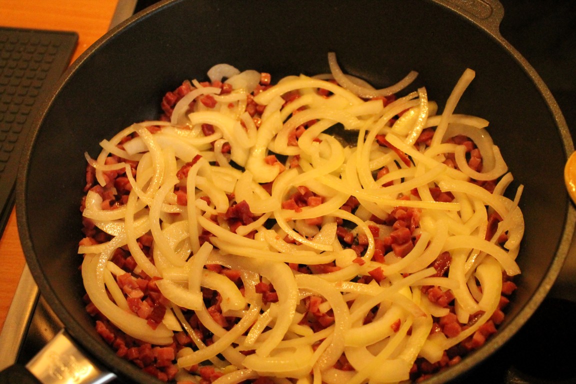 Die Kartoffeln schälen und in ganz dünne Scheiben schneiden. Die Gemüsezwiebel ebenfalls schälen, halbieren und in feine Ringe schneiden. In der Gastrolux Pfanne (www.gastrolux-shop.de) etwas Öl erhitzen und die Schinkenwürfel ausbraten, die Zwiebelringe dazugeben und glasig braten. Dann auch noch ganz kurz die Kartoffelscheiben für das Gratin dazugeben und alles miteinander Vermengen. Die Kartoffel-Schinken-Zwiebel-Mischung in eine Auflaufform geben.