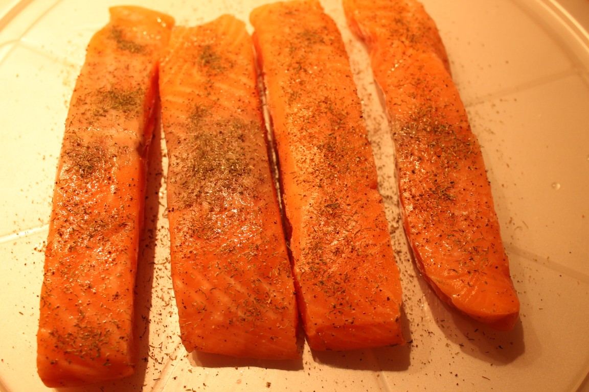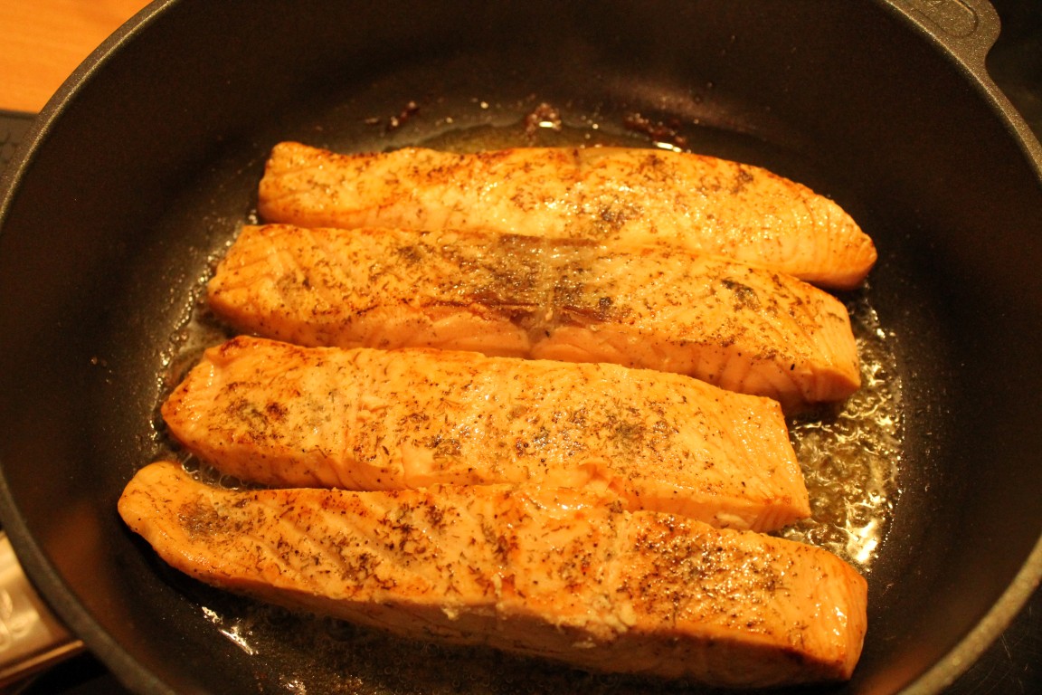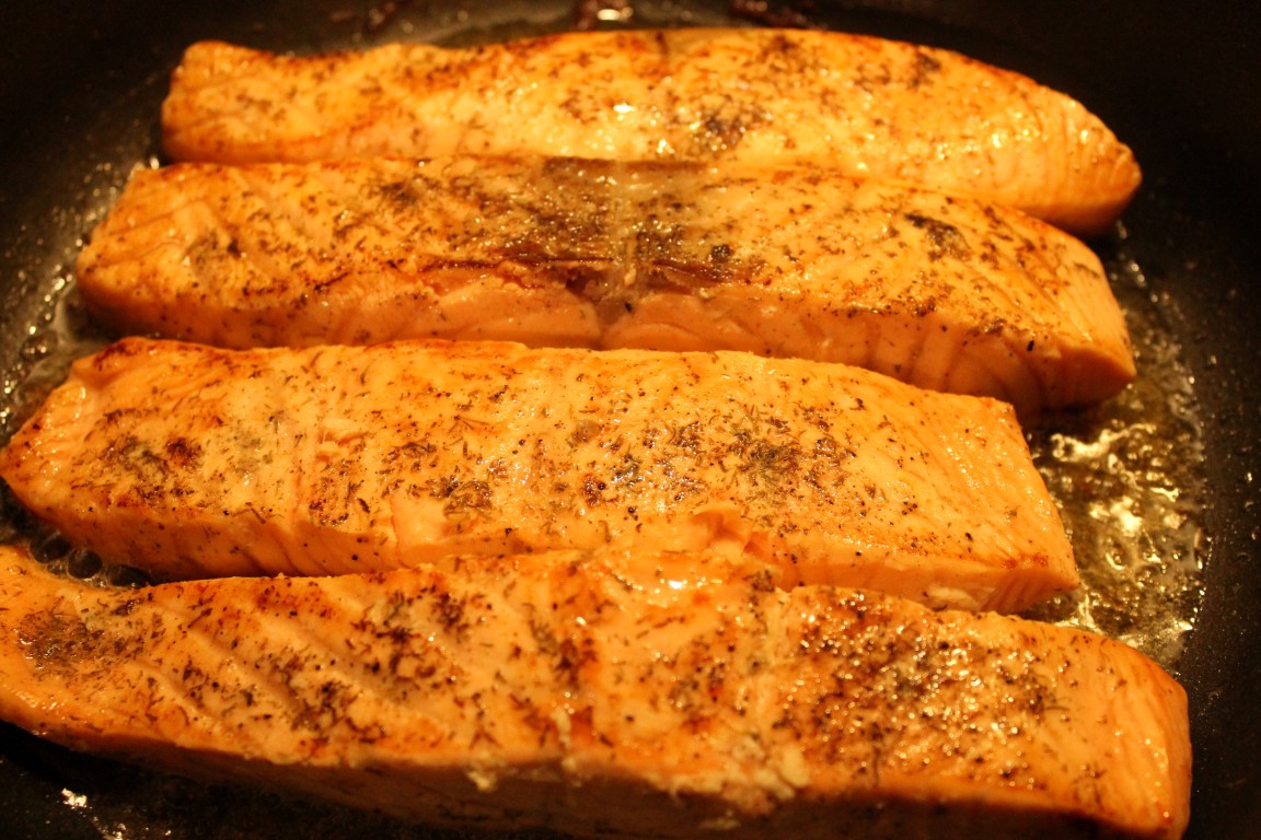 Die Lachssteaks (wenn nicht frisch sondern TK) auftauen lassen. Dann beide Seiten nacheinander mit Ztronensaft beträufeln, dann mit Chili, Pfeffer und Salz aus der Mühle würzen. Am Ende noch auf beiden Seiten etwas Dill drüber streuen (mind. 30 Minuten einziehen lassen). Dann etwas Öl und Butter in der Gastrolux-Pfanne (www.gastrolux-shop.de) erhitzen und die Lachssteaks hineingeben. Jede Seite ca. 4 Minuten braten, so dass die Lachssteaks außen kross sind und innen zart und saftig bleiben.