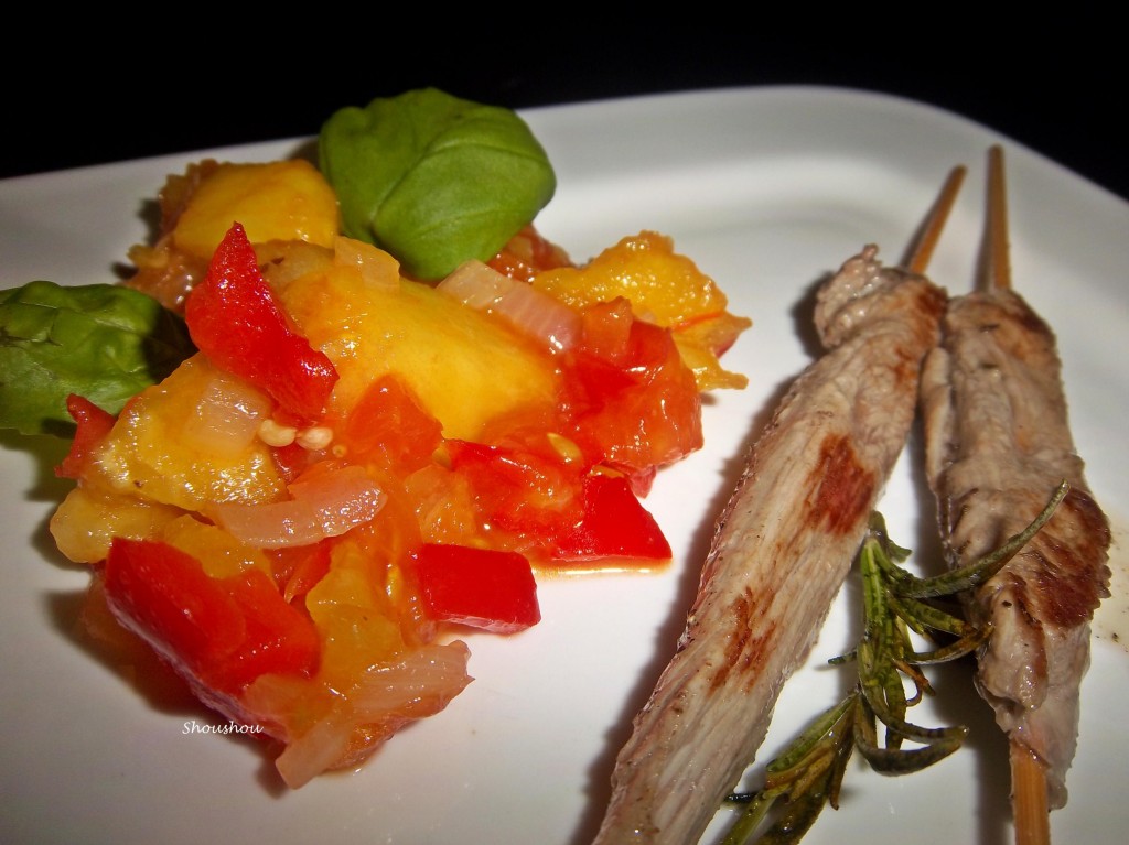 Satéspieße vom Lamm mit Ananas-Sambal Zutaten für 4 Personen:600 g Lammlachse 1/4 frische Ananas 4 Tomaten 1/2 rote Parikaschote 2