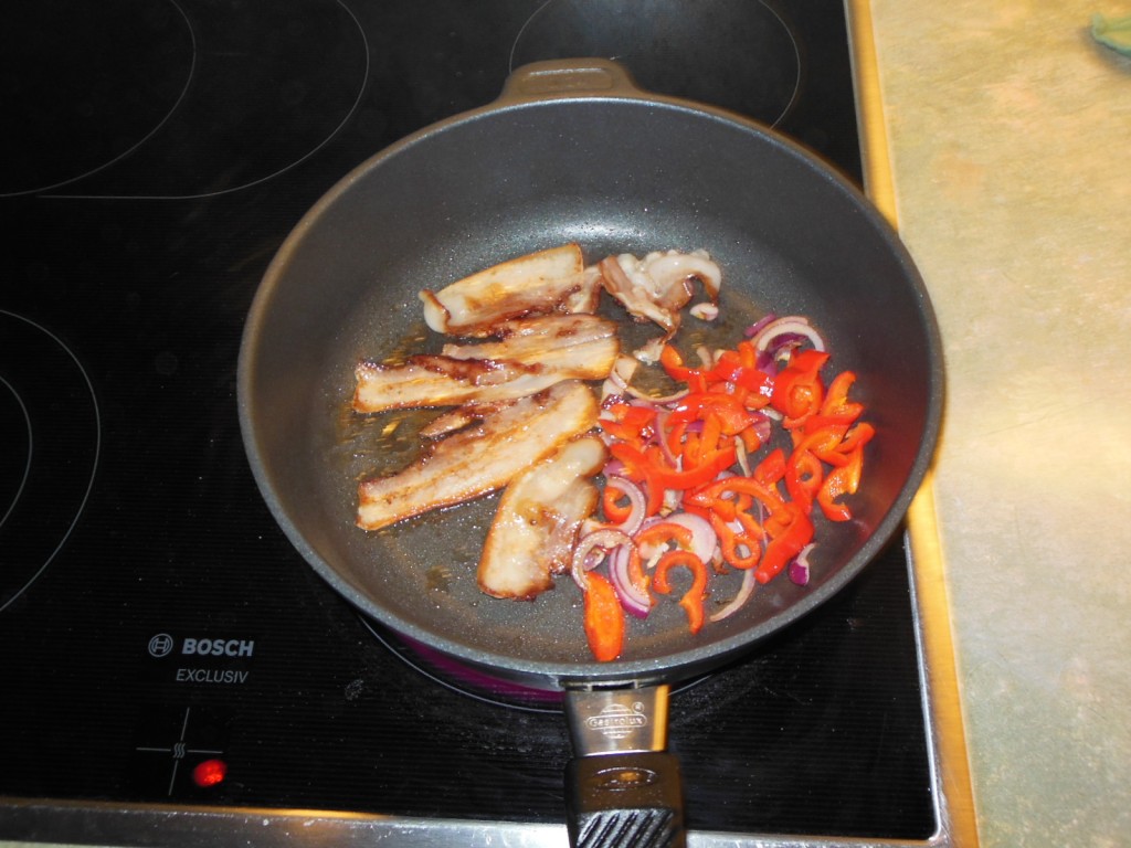 Ungarische Frühstückspfanne Erinnerung an Ungarn-Urlaub Speck, Zwiebel, Paprika anbraten, 2 Eier dazu, je nach Geschmack kräftig würzen Ergebnis in der