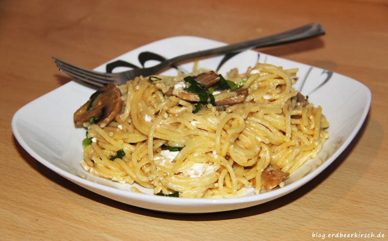 Pasta in Champignon-Sahnesoße und Feta Zutatenliste eine Packung Spaghetti 200g Champignons 1/2 Block Feta 1-2 Frühlingszwiebeln Knoblauch, Kräuter 100-200ml Sahne