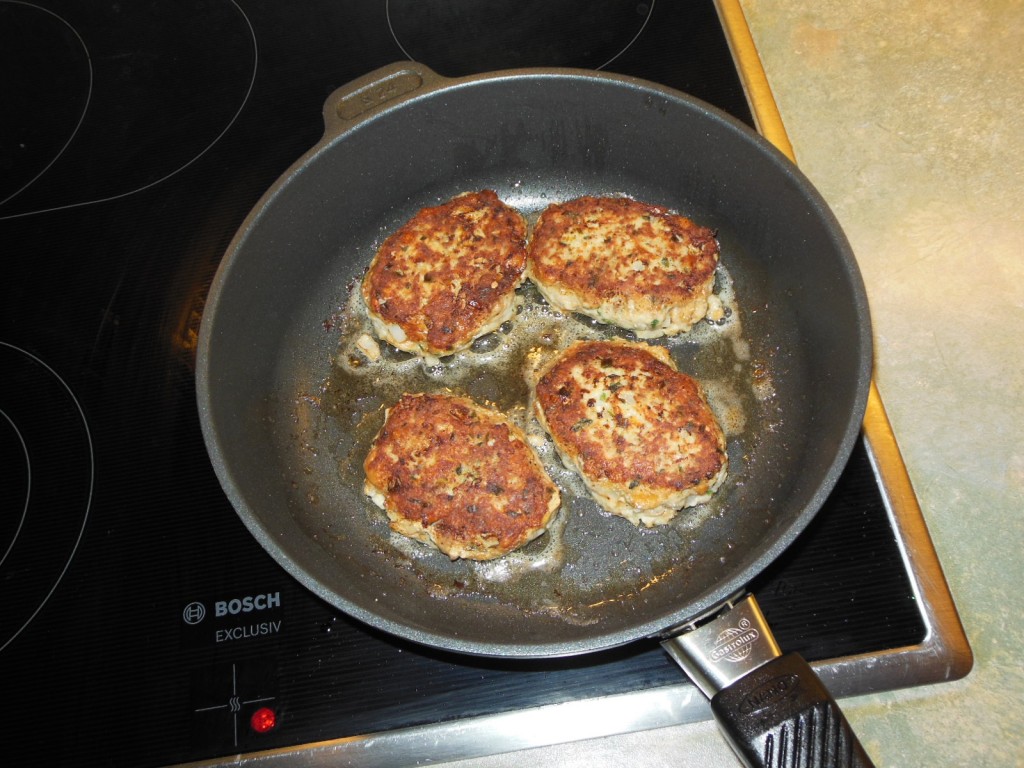 Hacksteak mit Kartoffel-Gurkensalat ca doppelt so dick, wie Fleischpflanzerl, deshalb langsam durchbraten, super Ergebnis , siehe Bilder und Video, Pfanne