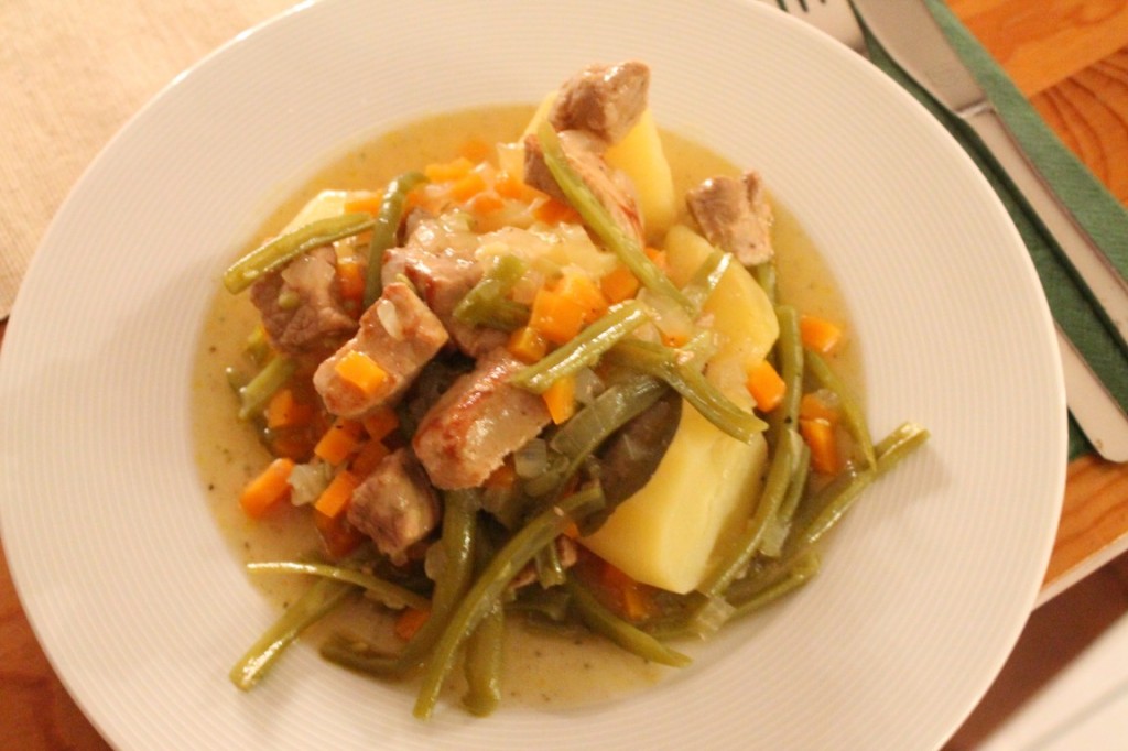 500 g Gulasch vom Schwein 2 Karotten 2 Gemüsezwiebeln 250 ml Weißwein 500 ml Gemüsebrühe 2 Lorbeerblätter Salz und Pfeffer