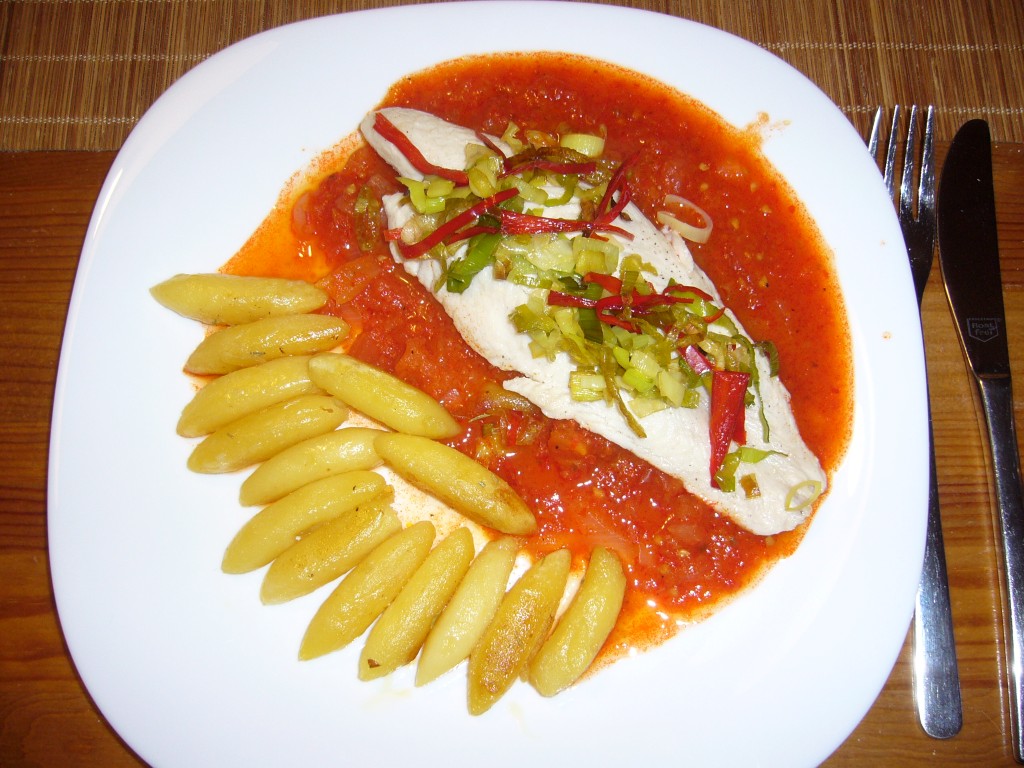Zutaten:1 kg Pangasiusfilets, TK, aufgetaut 6 EL mildes Ajvar 5 mittelgroße Tomaten 5 mittelgroße Zwiebeln 1,25 Liter Gemüsebrühe 3 Stangen
