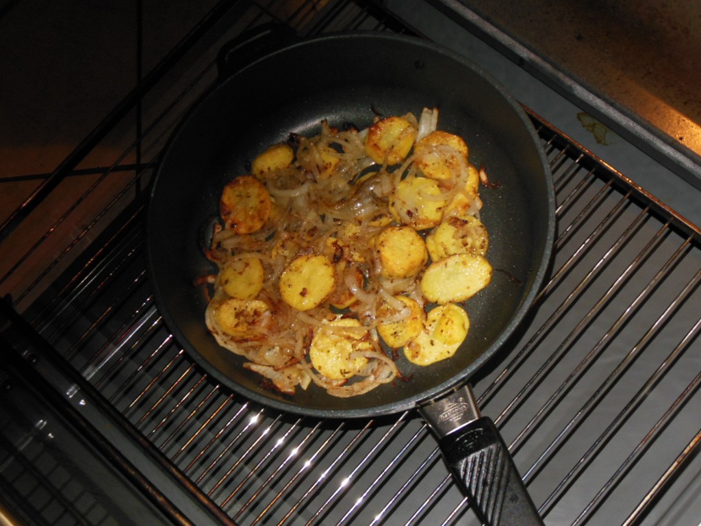 Röstkartoffeln mal anders, nämlich mit rohen Kartoffelscheiben, mit viel Zwiebeln scharf anbraten, dann ab in den Ofen bei 240°, Ergebnis