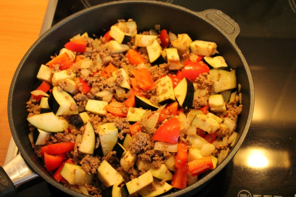 Zutaten: 500 g Rinderhack 1 Gemüsezwiebel 1 Aubergine 1 Zucchini 1 rot Paprika 1 Knoblauchzehe 1 Tube Tomatenmark 2 große