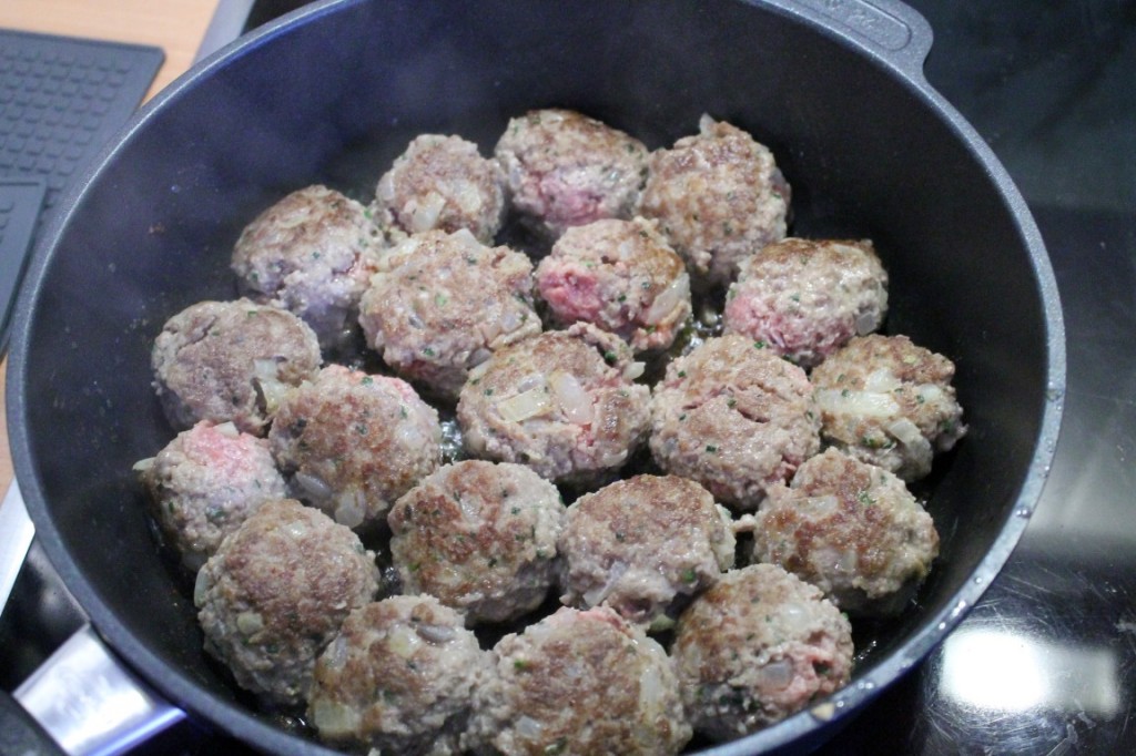 Zutaten: 500 g Rinderhack 1/2 Gemüsezwiebel 5 EL Paniermehl 400 ml Sahne 250 ml Rinderbrühe Scnittlauch (getrocknet oder TK) Pfeffer