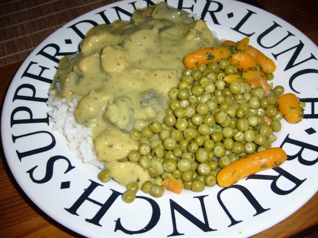 Das Gemüse mit der Sahne und der Hühnerbrühe ablöschen und aufkochen lassen. Das Fleisch, den Kräuterfrischkäse, Wein und das Currypulver unterrühren und erhitzen. Das Geschnetzelte mit Soßenbinder andicken und mit Salz und Pfeffer abschmecken. Die Petersilie unter das Geschnetzelte rühren.