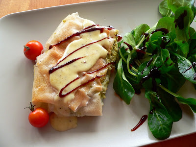4 Je 1/4 des gewaschenen Salats mit dem Dressing auf Teller anrichten, pro Teller ein Brick dazulegen, mit dem Sahneschaum dekorativ anrichten und mit der Crema di Balsamico dekorieren.