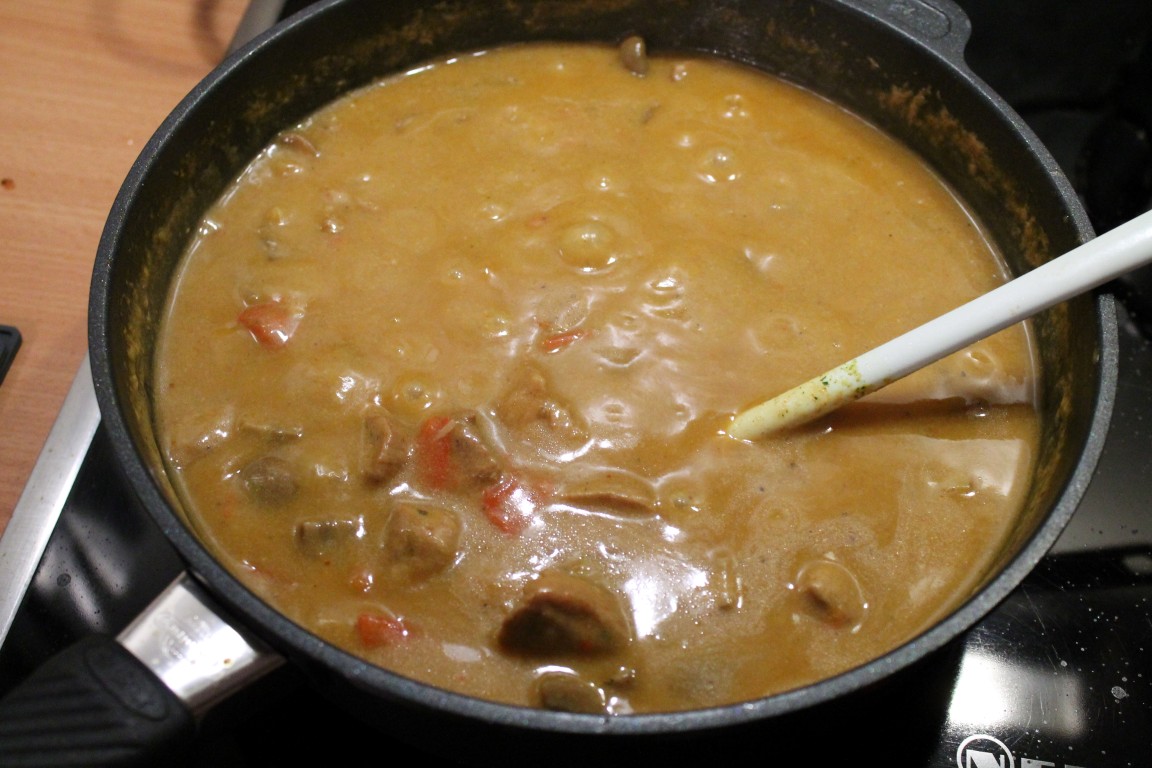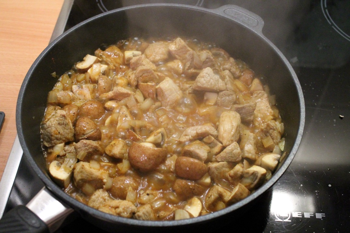 Die Zwiebeln schälen und in grobe Würfel schneiden, die Champignons putzen und vierteln, die Paprika ebenfalls in grobe Würfel schneiden. Etwas Olivenöl in der Pfanne erhitzen, das Fleisch scharf in der Gastrolux Pfanne (www.gastrolux-shop.de) anbraten und mit Pfeffer, Salz und Paprikapulver schwarf würzen. Dann die Zwiebeln dazugeben und mit anbraten. Wenn die Zwiebeln glasig sind, die Champignons und Paprika dazu geben und ebenfals mit anbraten. Das Ganze dann mit der Brühe ablöschen, Lorbeerblätter dazugeben und aufkochen.Dann den Deckel mit geöffneter Entlüftung auf die Pfanne geben und bei kleiner Hitze ca. 1,5 bis 2 Stunden schmoren. Dann die Lorbeerblätter entfernen und die Sahne zugeben. Mit Paprika und Pfeffer abschmecken. Mit in Wasser aufgelöster Speisestärke oder braunem Soßenbinder nach Gusto andicken.Dazu schmecken am besten Salzkartoffeln und Rotkohl, aber auch Nudeln und ein Tomatensalat oder rote Beete.