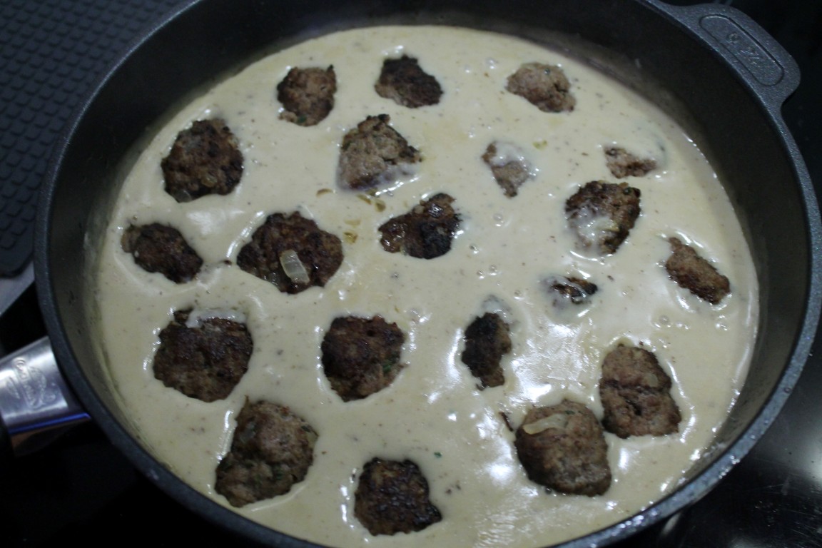 Die Zwiebel fein hacken oder in feine Würfel schneiden und in etwas Butter in der Gastrolux-Pfanne (www.gastrolux-shop.de) glasig braten. Das Paniermehl mit 3 TL Wasser und 5 TL Sahne verrühren und zusammen mit den Zwiebel zum Rinderhack geben. Dieses mit Pfeffer und Salz aus der Mühle würzen, Schnittlauch (3 TL) dazugeben, alles vermengen und dann kleine Bällchen darauf formen. Die restliche Butter in die Gastrolux-Pfanne geben und dann die Hackbällchen darin braten, bis sie durch sind. Die fertigen Hackbällchen aus der Pfanne nehmen und das Mehl hineingeben, mit einem Rührbesen mit der Butter vermengen (= Mehlschwitze) und mit der Brühe ablöschen. Dann noch die restliche Sahnme dazugeben und weiter mit dem Schneebesen verrühren, so dass eine sämige Soße entsteht. Mit Pfeffer, Salz und Piment nach eigenem Gusto abschmecken. Dann den Deckel auf die Pfanne geben und die Soße ca. 10 Minuten auf kleiner Flamme köcheln lassen.