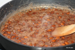 Es kommt genau so viel Zucker wie Mandeln in die Panne – bei mir also 400 g. Dazu Zimt nach Belieben (heute mal ein wenig mehr), eine Prise Salz und halb so viel Wasser wie Mandeln – also 200 ml.