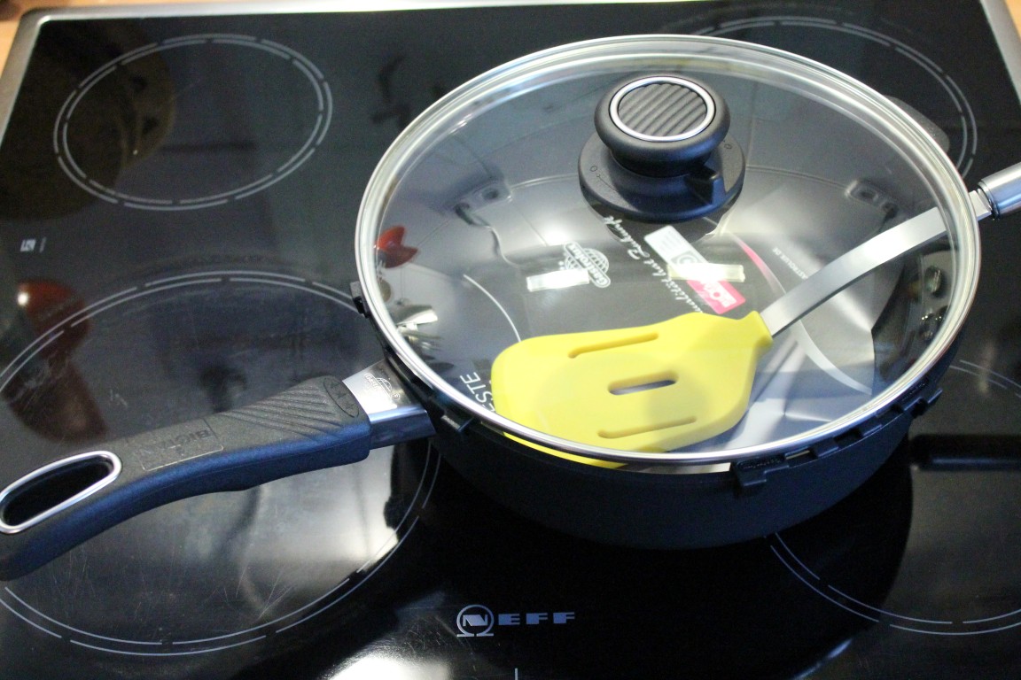 Wir haben die Hochrand-Pfanne inzwischen auch schon einmal benutzt, um Schnitzel zu frittieren. Das Fett wurde extrem schnell heiß, so dass auch die Schnitzel sehr schnell „durch“ waren und durch die hohe Hitze kaum Fett aufnahmen. Auch beim Frittieren kann man sehr schnell die Energiezufuhr reduzieren, was bei unseren bisher benutzten Pfannen nie möglich war. Bei unseren alten Pfannen mussten wir die Energiezufuhr den kompletten Frittiervorgang über auf höchster Stufe belassen.