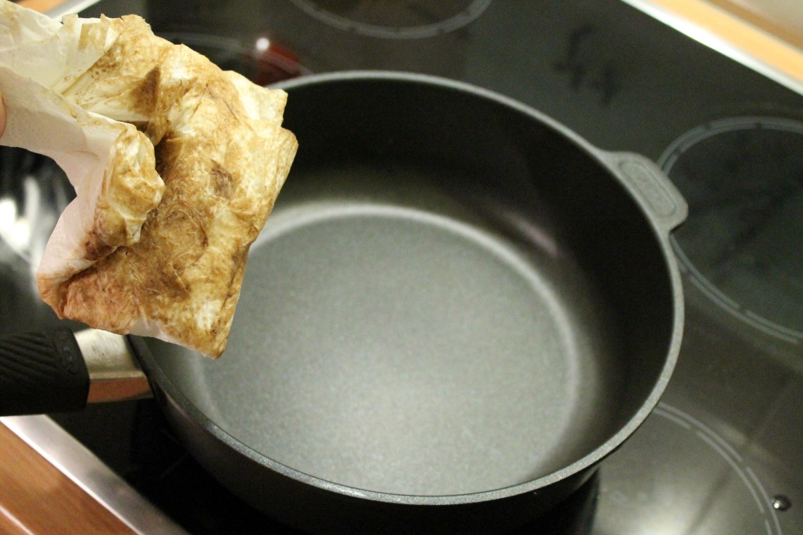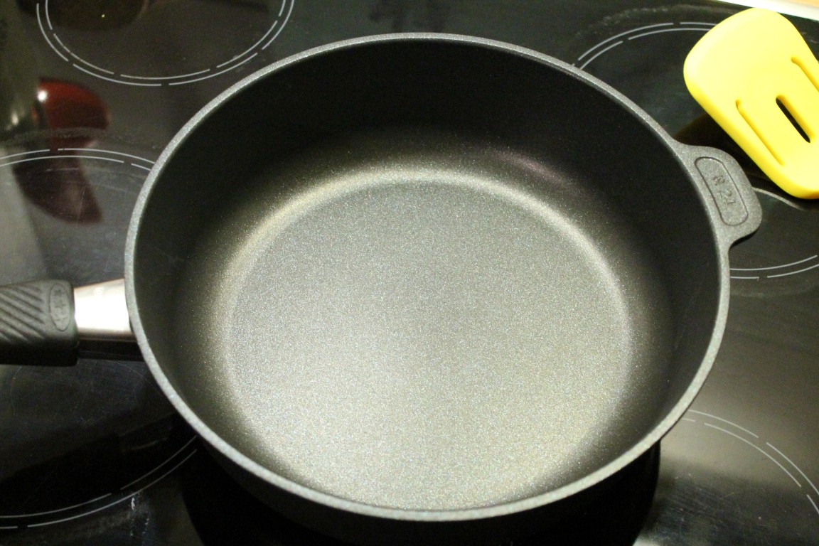 Vor dem ersten Gebrauch der Gastrolux Pfanne haben wir sie mit warmen Wasser ausgewaschen, mit ein wenig Öl eingepinselt und dann mit einem Stück Küchenrolle ausgerieben. Dann sprühten wir ein wenig Olivenöl hinein und erhitzten die Pfanne auf höchster Stufe. Das Fett wurde unheimlich schnell heiß (ungefähr doppelt so schnell wie bei den Pfannen, die wir bisher benutzten) und bildete durch den hochwertigen Antihafteffekt sehr schnell kleine „Perlen“.