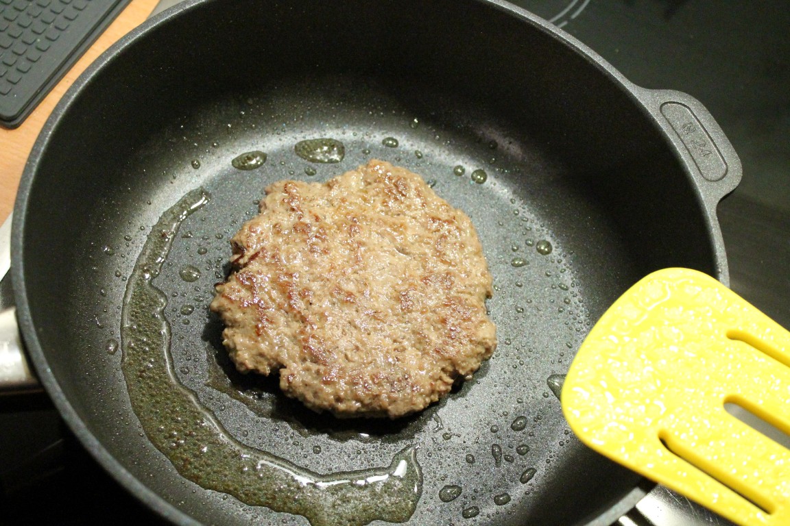 Wir haben beim ersten Mal Hamburger in der Gastrolux Pfanne gebraten. Nachdem wir das Fleisch von beiden Seiten scharf angebraten hatten, regelten wir die Energiezufuhr sehr weit herunter. Trotzdem blieb das Fett in der Gastrolux Pfanne dauerhaft heiß, so dass wir das Fleisch auch bei geringer Energiezufuhr durchbraten konnten. Der Pfannenboden ist 8 mm dick und sorgt für eine optimale Hitzeverteilung. Das Burgerfleisch war sehr schnell durchgebraten. Der Burger ist zu keinem Zeitpunkt an der Pfanne festgebacken, was dem hochwertigen Antihafteffekt zu verdanken ist. Durch diesen Effekt kann man das Bratgut auch mit sehr wenig Fett braten, was natürlich auch zu einer gesünderen Zubereitung von Gebratenem führt. Auch bei und nach dem Braten bildet das benutzte Fett durch die BIOTANPLUS-Oberflächenveredelung weiterhin kleine Fettperlen.