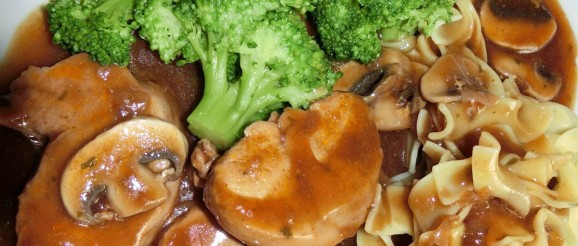 Heute haben wir Hähnchen-Schnitzel an Champignon-Weinsoße mit Nudeln und Brokkoli gezaubert.