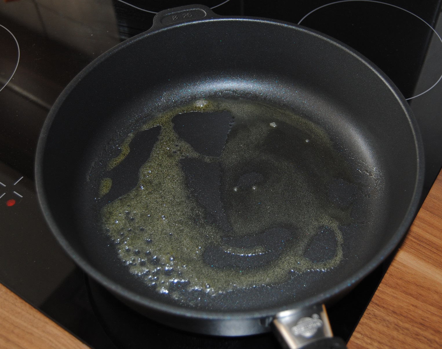 Zum Testen habe ich eine Pfanne mit 26cm Durchmesser und einer Höhe von 7cm bekommen. Die Höhe finde ich echt klasse, so kann man auch mal mehr kochen und schlabbert generell weniger. Der Stiel ist fast 20cm lang und liegt griffig in der Hand. Nur das Hochheben wird zu einem kleinen Problem: Die Pfanne wiegt stolze anderthalb Kilo. Da ich gerne während des Kochens die Pfanne in die Hand nehme und schüttle, wird das meist zum Kraftakt… Der Boden ist 8mm stark nach DIN und bietet eine optimale Hitzeverteilung.