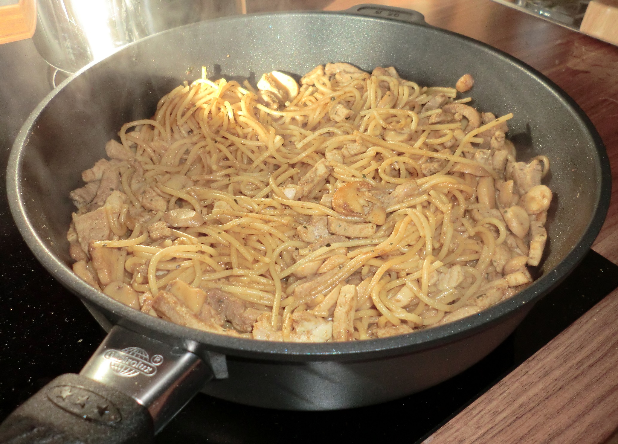 Generell ist zu sagen, dass das Ergebnis stets gut war: Alle Speisen waren gleichmäßig durch, nichts hat gepappt, die Panade blieb schön am Essen, das Fleisch war saftig, der Geschmack blieb im Essen und der Entlüftungsknopf hat seinen Soll erfüllt. Damit bin ich also voll und ganz zufrieden. Was etwas stört, ist das lange Warten, dass die Pfanne heiß wird, was an der Beschichtung liegt. Ist sie erstmal heiß, speichert sie diese Wärme aber ganz gut und gibt sie gleichmäßig ab. Deswegen ist dies vor allem bei Gerichten, die länger garen müssen zu empfehlen. Für mal eben kurz etwas braten dauert es dann aber doch zu lange. Toll ist der hohe Rand, der es ermöglicht nicht nur viel zu kochen, sondern dies auch ohne überzuschwappen. Auch habe ich das Gefühl, dass die Pfanne deutlich weniger Fett zum Braten braucht.