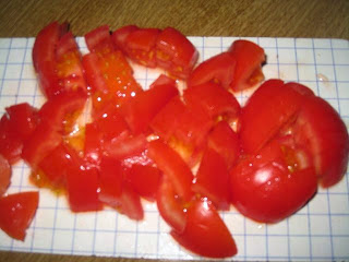 Hähnchenbrust in Streifen schneiden und anbraten und die Gemüse nach Wunsch dazu geben. Wir nahmen hier Zwiebeln, Möhre, Paprika und Tomate.